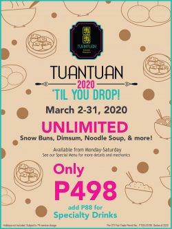 Enjoy unlimited Pork Buns, Dimsum, and other delicious HongKong comfort food as we bring back TUANTUAN ‘TIL YOU DROP 2020! Beginning March 2, you can now treat yourself to all your favorite TuanTuan dishes for only P498! You can also avail of special drinks for only P88 each!